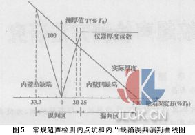 根據(jù)鋼中聲波速度約為在水(油)中的4倍(v鋼≈5800 m/s,v水≈1450 m/s),可采用下面公式計算出常規(guī)超聲檢測管內(nèi)點坑和凸缺陷典型數(shù)據(jù)和誤判漏判曲線圖(圖5):
