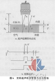 4寬頻超聲相位識別數(shù)據(jù)處理技術(shù)解決誤判問題 為解決誤判、漏判的問題,研究了寬頻超聲波形相位識別和數(shù)據(jù)處理的技術(shù)方案。由于石油聲阻抗(Z1)<鋼材聲阻抗(Z2),而Z2>空氣/土壤聲阻抗Z3,因此內(nèi)管壁表面反射波(A,A′)與底面反射波(B1,B1′)相位相差180°(圖6)。利用寬頻超聲電路實現(xiàn)相位識別功能,便可以很容易的從回波中區(qū)分表面波(A、A′)和底面波(B1、B1′)。超聲分析電路正選通出表面波A、A′,便可用油聲速計算出腐蝕點坑深度(內(nèi)凸缺陷高度)H。超聲分析電路負選通出底面波B1,并利用A波B1波,計算出管壁正常厚度T0。采用公式計算出:內(nèi)腐蝕點坑處真實的厚度T=T0-H;內(nèi)凸缺陷處真實厚度T=T0+H。