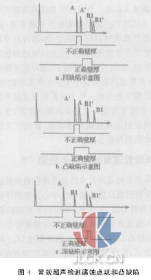 3管道內(nèi)壁腐蝕常規(guī)超聲檢測技術(shù)誤判漏判原因分析 (1)當探頭檢測到內(nèi)壁很淺的小點坑時(深度<0.2T0),因聲束的面積大于點坑,會在形成未腐蝕管壁處回波A和B1時,也形成腐蝕點坑處回波A′和B1′。并且淺點坑處表面波A′將在B1底波前(圖4a)。由于常規(guī)超聲沒有相位識別的能力,無法區(qū)分出A′和B1′,這樣,超聲儀器將把A′誤認為底波B1,將根據(jù)A、A′之間時間計算管壁厚度,得到管壁厚度很薄的錯誤結(jié)論。 (2)同理,當內(nèi)管壁出現(xiàn)小凸缺陷時,也會出現(xiàn)誤判的情況(圖4b)。凸缺陷對管道正常運行不會造成危害,但是檢測儀器會誤認為在凸缺陷處管壁非常薄。 (3)當探頭檢測到小于探頭聲束面積的內(nèi)壁很深腐蝕點坑(深度>0.25T0)時,因點坑處的表面波A′已在B1后,常規(guī)超聲將按A、B1回波計算管壁厚度,得出管壁無變化的錯誤結(jié)論,出現(xiàn)漏判腐蝕深點坑問題。