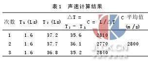 2.3聲速測定 利用CTS-25型時間讀數(shù)裝置,取一試樣 50×100 mm,用50KC-28探頭,測量超聲波通過試樣時間,并計(jì)算聲速(見表1)。
