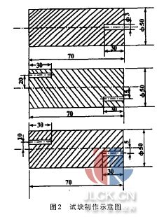 2.2試塊制作 在工件無缺陷部位截取3~5節(jié)試棒,規(guī)格 50×70 mm,采用中間疏、周邊密集和1/5R間距原則,鉆 3×30 mm長橫孔,其鉆孔理論推導(dǎo)較繁,故本文不贅述(圖2),同時制作DAC曲線。