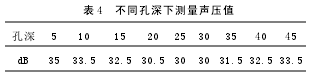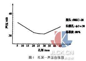 2.6“孔深—聲壓”曲線制作 將兩探頭中心對準(zhǔn)試棒不同孔深同一直徑長橫孔,調(diào)節(jié)儀器,使接收的聲波為80%滿刻度,測量聲壓值(表4)。其孔深與聲壓曲線圖見圖4。