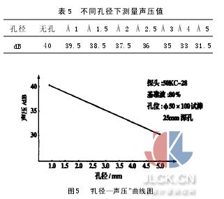 同理:可做不同的探頭,不同孔徑;或相同的孔徑,不同的探頭;或相同的探頭,不同的孔徑的孔深—聲壓曲線。 2.7“孔徑—聲壓曲線”制作 將兩探頭中心對準(zhǔn)同一深度位置不同孔徑的長橫孔測量其穿透聲壓調(diào)節(jié)儀器,使透過波聲壓為80%滿刻度,測量聲壓值(表5),并用坐標(biāo)表示出來(圖5)。