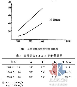 α= (dB1 -dB2)/L(3) 式中α—超聲波在碳棒中傳播時的衰減系數(shù),dB/mm dB1—兩探頭不通過碳棒對接的接受聲壓 dB2—兩探頭通過碳棒對接時的接受聲壓 L—碳棒長度,mm 2.5頻率及探頭選擇原則 根據(jù)石墨碳的頻率特性曲線(見圖3),最好用16-200 kHz頻率探頭,探頭尺寸大,通過材料的聲能也大,頻率高,擴(kuò)散角θ小,指向性好,發(fā)現(xiàn)遠(yuǎn)距離小缺陷的能力高,但近場長度較長。本文所使用的三種探頭的α、β、θ、N計(jì)算如下(見表3): N=D2/4λ(4) 式中N—近場區(qū)長度 D—探頭晶片直徑 λ—波長 θ= 29λ/D(5) 式中θ—半擴(kuò)散角 λ=C/f(6) 式中C—聲速 f—探頭振動頻率 sinα=d/2R(7) 式中α—入射角 R—探頭晶片半徑 sinβ= sinα×C碳/C環(huán)(8) 式中β—折射角 C環(huán)—超聲波在環(huán)氧樹脂中的聲速 C碳—碳棒中的聲速