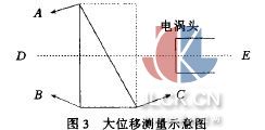 其中,距離利用塞規(guī)測定。由圖可以看出,在0.5一6mm之間,該傳感器的線性非常好。這一線性接近傳感器為我們提供了一種很好的大位移測量方 法的物質(zhì)基礎(chǔ)。具體思路是這樣的:如圖3,讓工廠加工一塊如圖所示的金屬鋁三角形劈,其中八B長度由所測量的位移大小決定,BC長為5.smm,保證電渦 流頭到達(dá)底部BC處時,距劈為0.smm;在頂部A處時,距劈為6mm。實際測量位移時,由于電渦流頭連接外測量電路,可以將三角劈與運動體相連,將電渦 流頭與臺座相連。于是,電渦流頭輸出電壓值可以反映運動體的位移。綜上所述,采用三角劈,并結(jié)合線性接近傳感器可以很好地實現(xiàn)大位移無接觸測量。