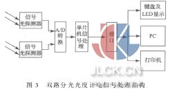 如圖2所示的單色光經(jīng)過半反透鏡1分光,透射光為信號光通過樣品池2后由信號光電探測器3接收,反射光直接由參考光電探測器4接收;雙通道電荷采樣器5的兩個信號輸入通道分別接信號光電探測器3和參考光電探測器4的電流信號輸出端,直接采集光電探測器3、4的輸出光電流,積分轉(zhuǎn)換為電荷信號進(jìn)行A/D采樣;信號光電探測器3和雙通道電荷采樣器5的安裝在同一塊采樣電路主板,兩者距離應(yīng)盡量小可減少電荷傳輸過程中的電磁干擾。由于結(jié)構(gòu)原因參考光電探測器4的輸出管腳無法直接接入雙通道電荷采樣器5所在的電路主板,采用低漏電同軸電纜8連接。同步信號發(fā)生器6提供雙通道電荷采樣器5運行所需的不同時序[2 ];控制器7提供雙通道電荷采樣器5和同步信號發(fā)生器6運行所需信號控制整個系統(tǒng)運行,電路主板通過電纜與控制器相連,調(diào)零、對數(shù)轉(zhuǎn)換等功能均在控制器內(nèi)完成。 2雙路分光光度計電路系統(tǒng)的實現(xiàn) 光信號經(jīng)過光電探測器后轉(zhuǎn)化為電信號,此時的電信號較弱[3 ]經(jīng)過放大、A/D轉(zhuǎn)換、信號處理并通過接口部分直接輸出到PC,對結(jié)果顯示以及打印全部通過相關(guān)計測軟件完成;而本文雙光路分光光度計信號處理硬件結(jié)構(gòu)圖如圖3所示。
