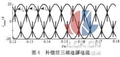 2仿真結(jié)果 A、B、C三相電源接晶閘管整流橋(阻感負(fù)載,R=30Ω,L=15 mH),B相同時(shí)還接有一個(gè)單相整流橋(R=20Ω)。仿真電路的參數(shù)為:SVG的接入電感為0.8 mH,電源電壓為380 V,直流側(cè)的電容電壓通過(guò)調(diào)節(jié)達(dá)到950V,開(kāi)關(guān)頻率為20kHz。補(bǔ)償前的電源電流和中線(xiàn)電流iO的仿真波形如圖5所示
